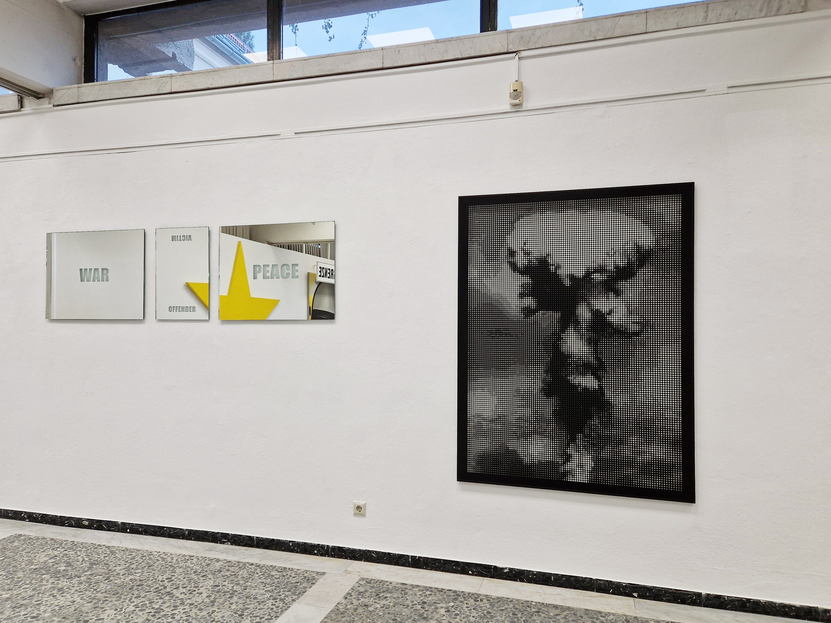 Melitta Moschik WAR-PEACE, VICTIM-OFFENDER 2025, sandgestrahltes Spiegelglas, je 60/40 x 80 cm; SCREEN BURN 2013, CNC-gestanzte schwarze Stahltafel, 120 x 160 cm;