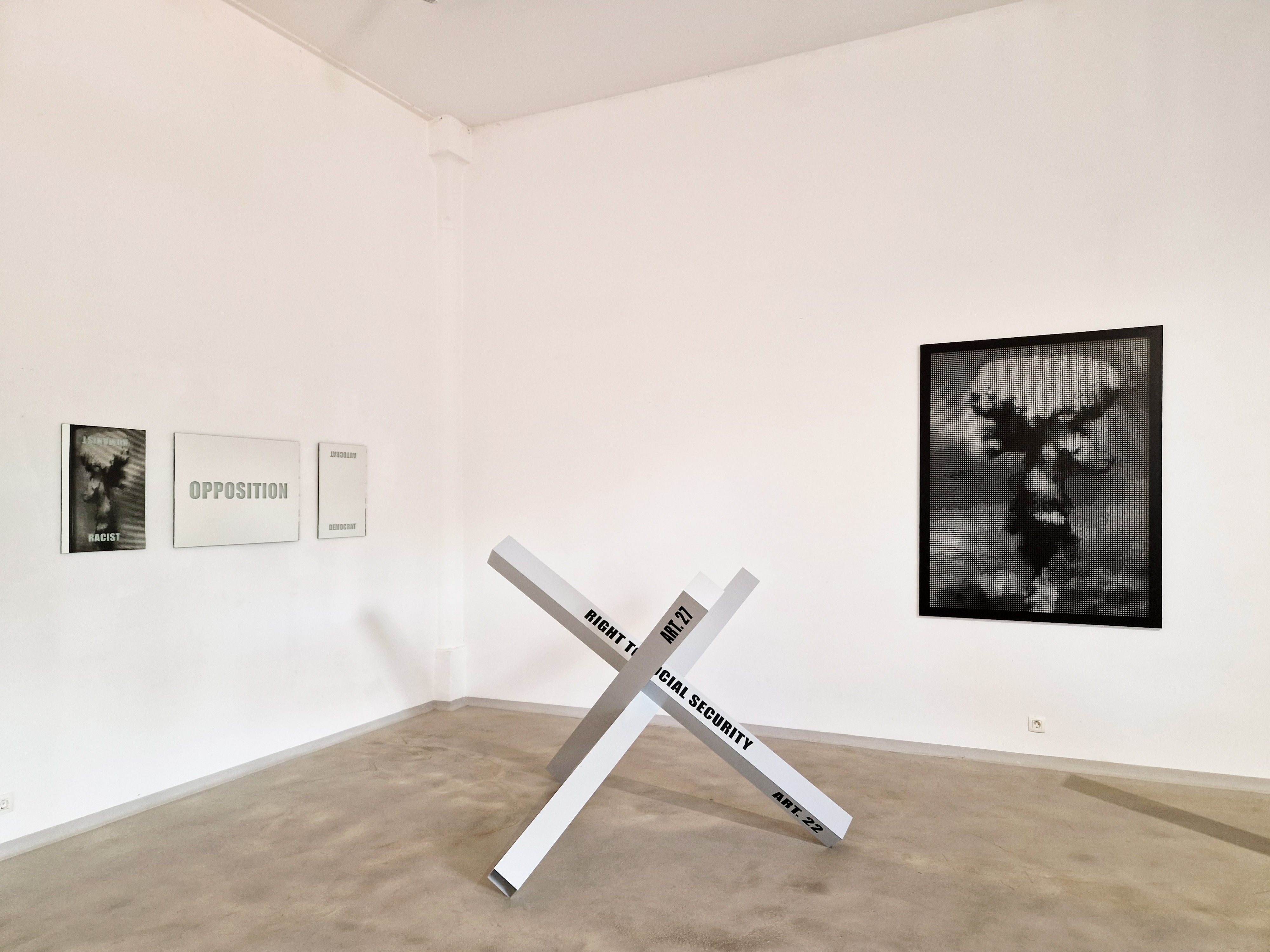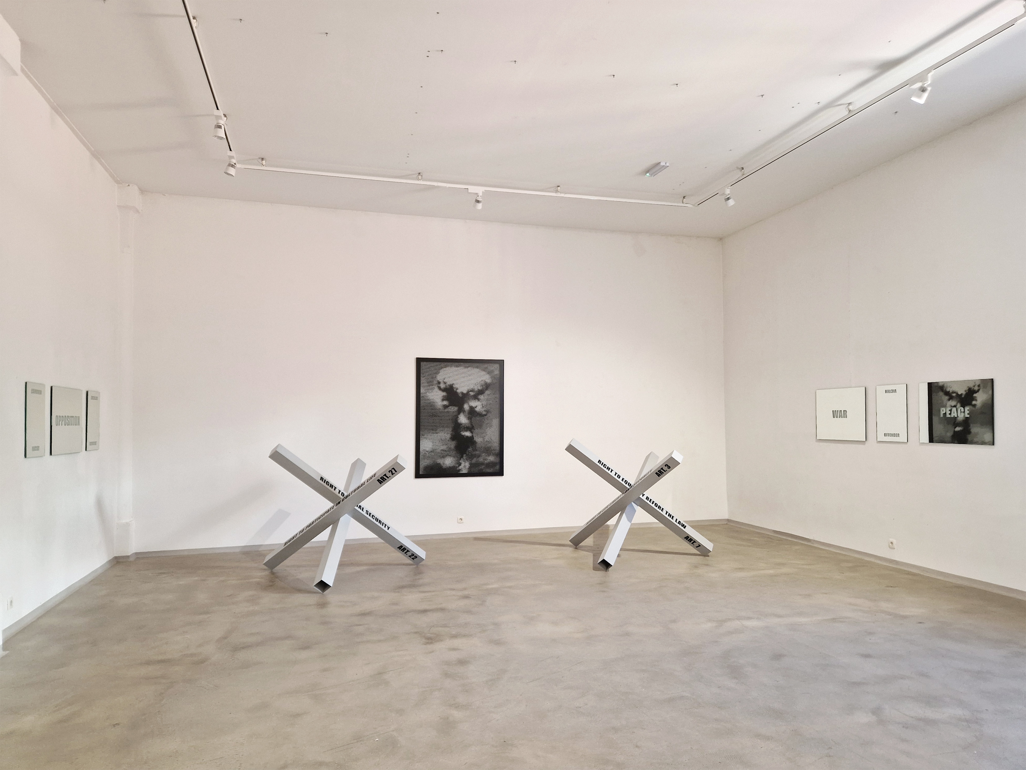 In der Werkserie DEFENDER kommentiert Melitta Moschik weltpolitische Zustände der Gegenwart. Drei kreuzweise miteinander verbundene Metallträger formieren sich jeweils zu einer raumgreifenden Skulptur in Form von Panzersperren. Schriftzüge auf den Formrohren lassen ausgewählte Artikel der Menschenrechte lesbar werden: ART. 3 – RIGHT TO LIFE LIBERTY AND SECURITY; ART. 7 – RIGHT TO EQUALITY BEFORE THE LAW; ART. 22 – RIGHT TO SOCIAL SECURITY; ART. 27 – RIGHT TO PARTICIPATE IN CULTURAL LIFE;