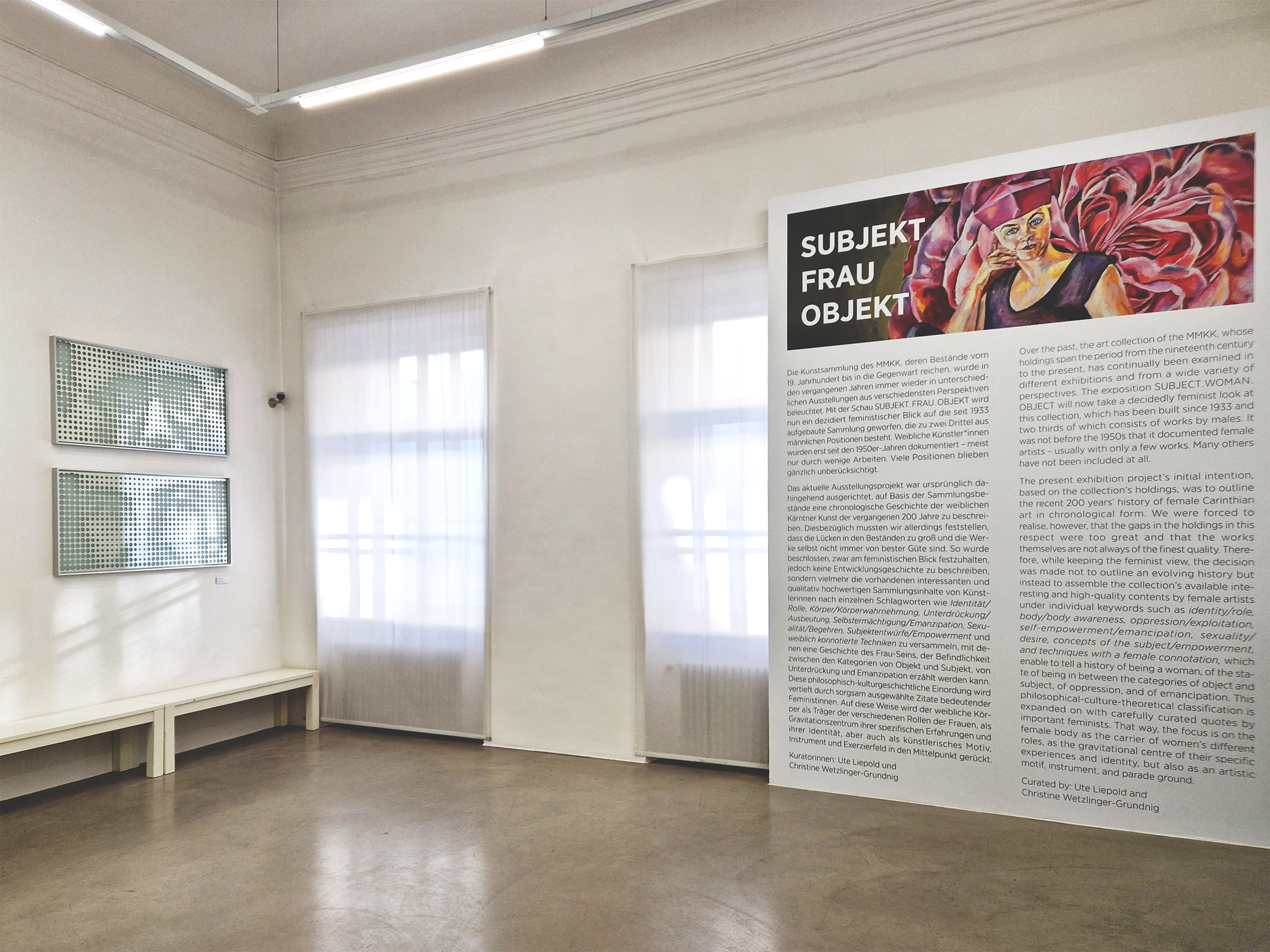 Die Ausstellung SUBJEKT. FRAU. OBJEKT wirft einen dezidiert feministischen Blick auf die seit 1933 aufgebaute Kunstsammlung des Landes Kärnten/MMKK, die Geschichten des Frau-Seins, ihrer Befindlichkeit zwischen Objekt und Subjekt. Ausgewählte Arbeiten von 30 Künstlerinnen, 9 Künstlern und einem Künstler*innen-Duo wurden nach weiblich konnotierten künstlerischen Techniken sowie nach inhaltlichen Aspekten wie Identität/Rolle, Körper/Körperwahrnehmung, Unterdrückung/Ausbeutung, Selbstermächtigung/Emanzipation, Sexualität/Begehren, Subjektentwürfe/Empowerment präsentiert. Zitate bedeutender Feministinnen vertiefen diesen philosophisch-kulturgeschichtliche Blick.