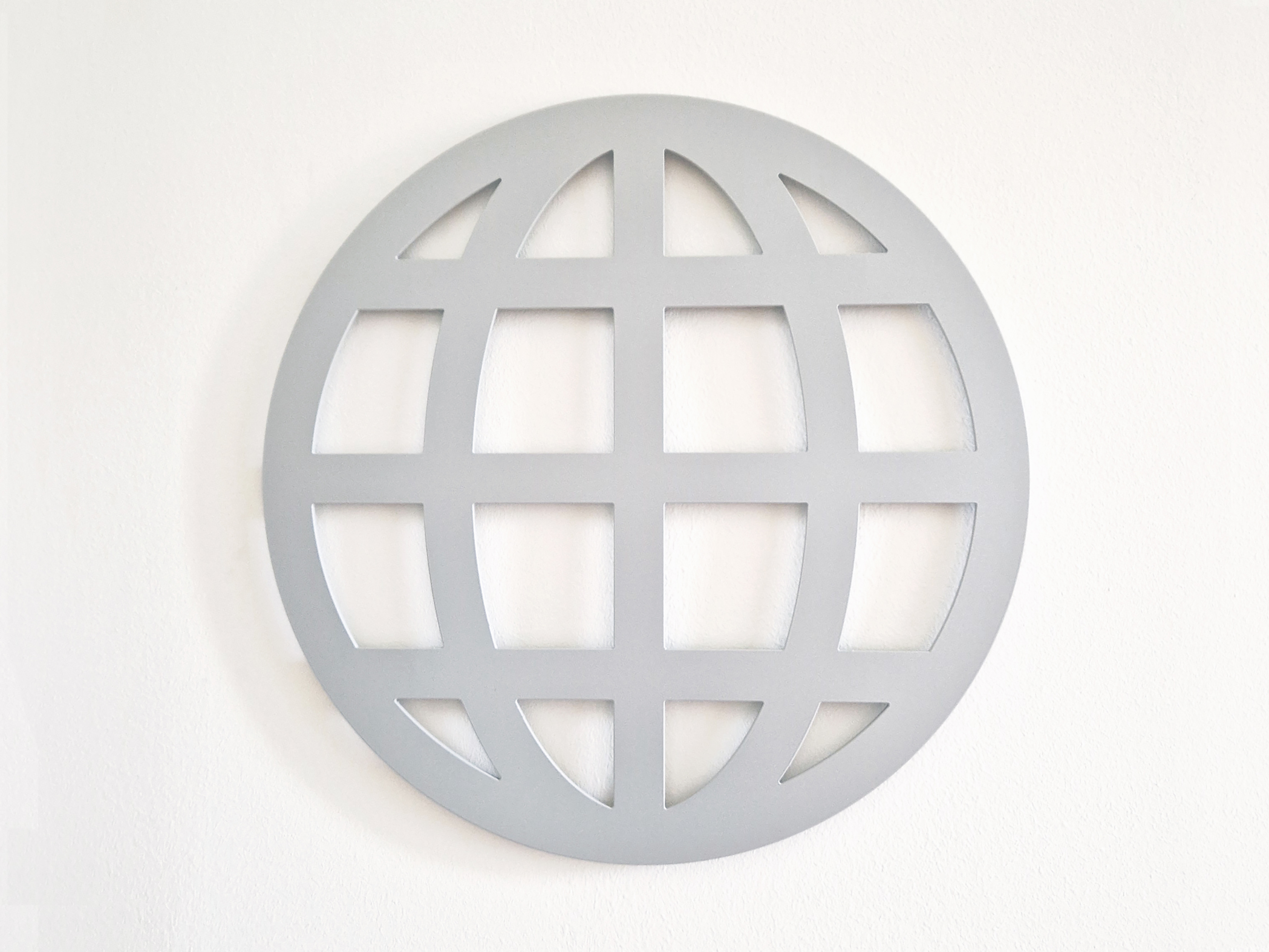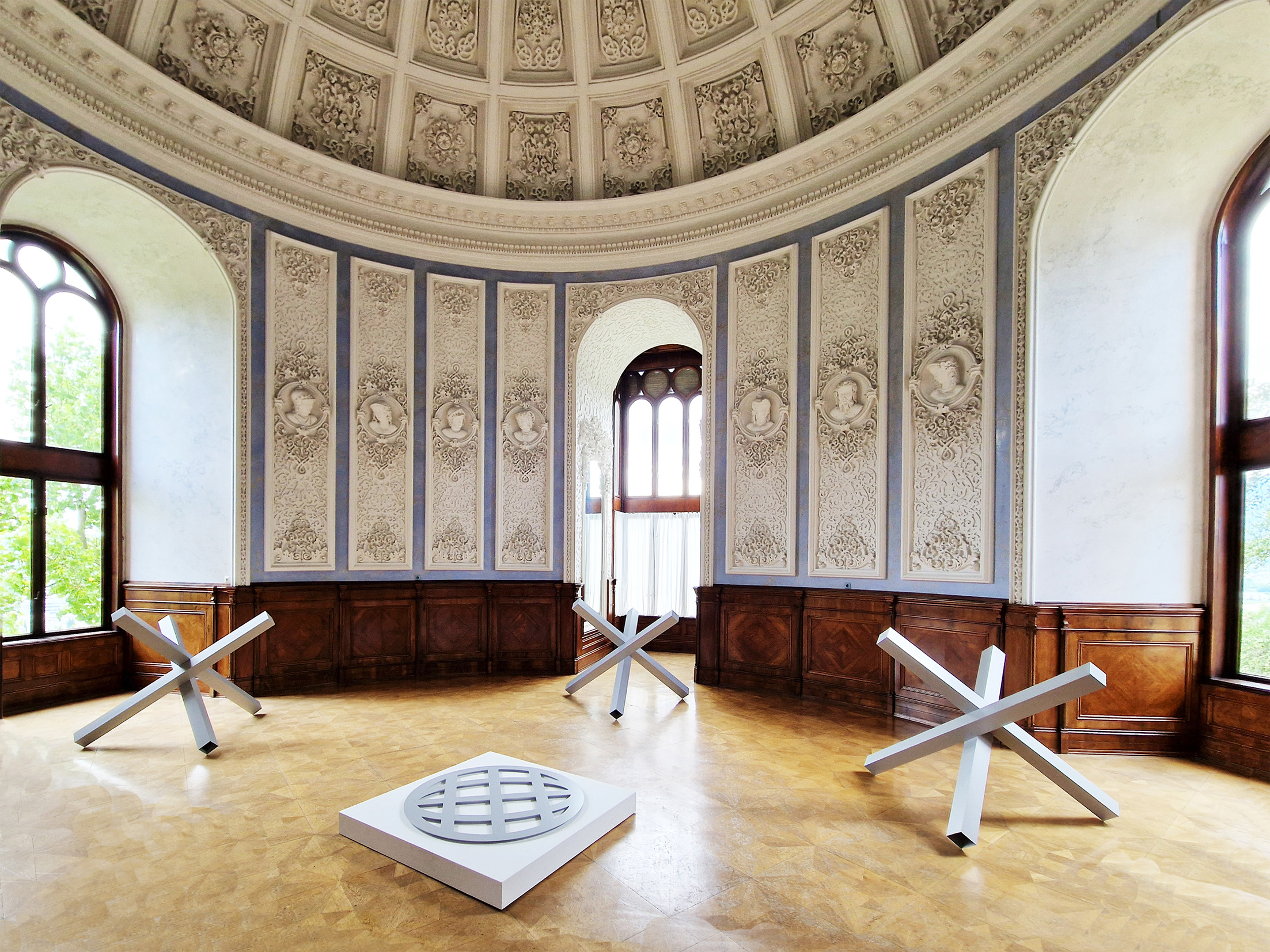Das Icon GLOBE verweist als Interface auf die digitale Benutzeroberfläche, mit welcher wir täglich kommunizieren und damit die Verbindung zur Welt halten. Als überdimensionales Bildzeichen greift das Metallobjekt das kugelförmige Modell der Erde auf. Im Prunksaal des Schlosses Wolfsberg, waagrecht auf einem Bodensockel präsentiert, tritt das Zeichen in Dialog mit der Kuppelarchitektur und lässt den Kosmos spürbar werden.